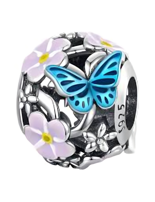 Charm Abalorio Flores Rosas y Mariposa Azul